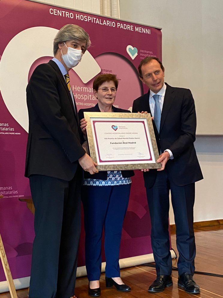 El director de Relaciones Institucionales del Real Madrid, Emilio Butragueño, ha recibido esta mañana en Santander el VIII Premio de Salud Mental Padre Menni (Hermanas Hospitalarias), de mano de la Superiora del Centro, Natividad Urdín. El hospital reconocía así la importante labor que desarrolla la Fundación Real Madrid, a través de sus programas y proyectos sociodeportivos, con los que garantiza la accesibilidad de todos al deporte de equipo y sus valores, sean cuales sean sus circunstancias o capacidades.