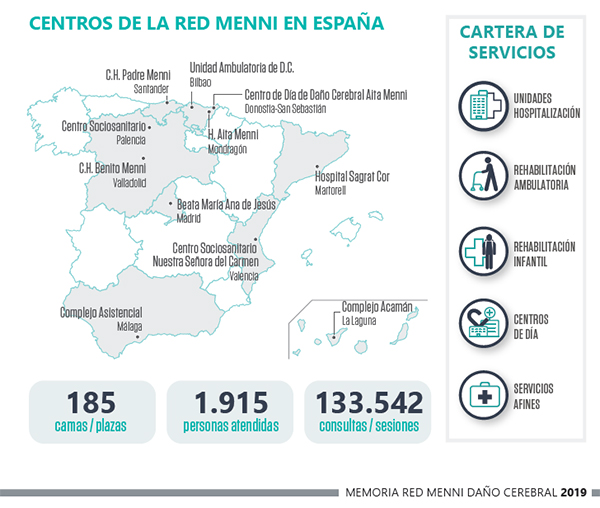 La Red Menni de Daño Cerebral fomenta el desarrollo de Servicios de rehabilitación de excelencia para personas con daño cerebral en el seno de los centros de Hermanas Hospitalarias España. Para ello hace uso del conocimiento y la experiencia de los centros decanos y trata de transferirlos con rapidez a todos los centros. Su carácter pionero en el Estado español y el amplio reconocimiento a la calidad prestada nos permiten aspirar a seguir siendo referentes en el panorama nacional. Estas son las principales cifras recogidas en la Memoria Red Menni.