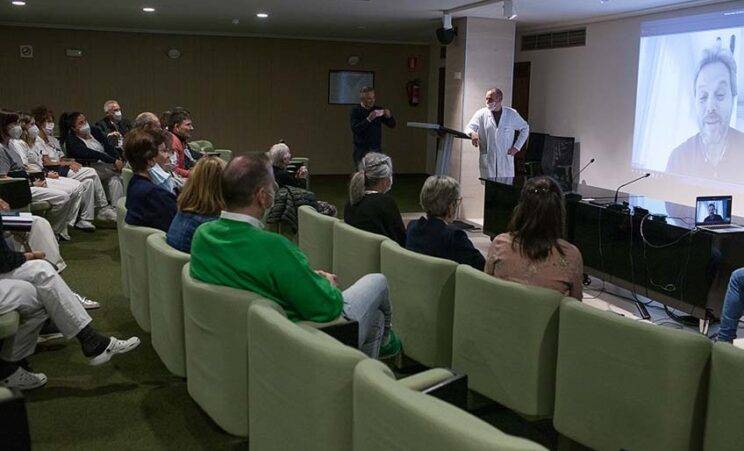 El salón de actos del Hospital Aita Menni fue escenario de una de las primeras proyecciones públicas de este documental. Una proyección que contó con un público muy especial: pacientes, personas usuarias de nuestros servicios, profesionales y otros integrantes de la Familia Hospitalaria que participaron en la grabación de este documental, meses atrás.