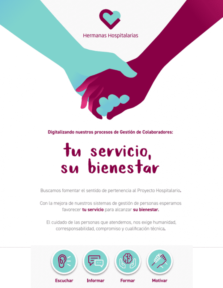 Hoy por hoy, la digitalización es ya un camino inevitable, y de no retorno. Un camino que toda organización debe recorrer si quiere tener una mayor capacidad de respuesta a los cambios de la sociedad. La tecnología como base para poder dar una respuesta ágil a las necesidades de los grupos de interés de las organizaciones. Ésta es una de las razones que nos han llevado a embarcarnos en éste proyecto de digitalización del Área de Personas. La modernización de los procesos de Recursos Humanos, abarca la gestión de la Administración de Personal, Nómina, Selección, Formación, Evaluación, Desarrollo, Planes de Carrera y Planes de Sucesión. Un proyecto en el que llevamos más de un año trabajando y que en los próximos meses será ya una realidad. Para Fuencisla de Santos, directora del Área de Personas de Hermanas Hospitalarias España: “los principales objetivos que nos hemos planteado con éste proyecto son mejorar nuestra comunicación interna y ganar en agilidad y eficiencia”. Todo ello alineado con la finalidad última que es mejorar la satisfacción de los colaboradores para que su SERVICIO mejore el BIENESTAR de las personas a las que atendemos. Compartimos aquí la comunicación que estamos realizando en todos los centros de cara al lanzamiento del proyecto. Seguiremos informando…
