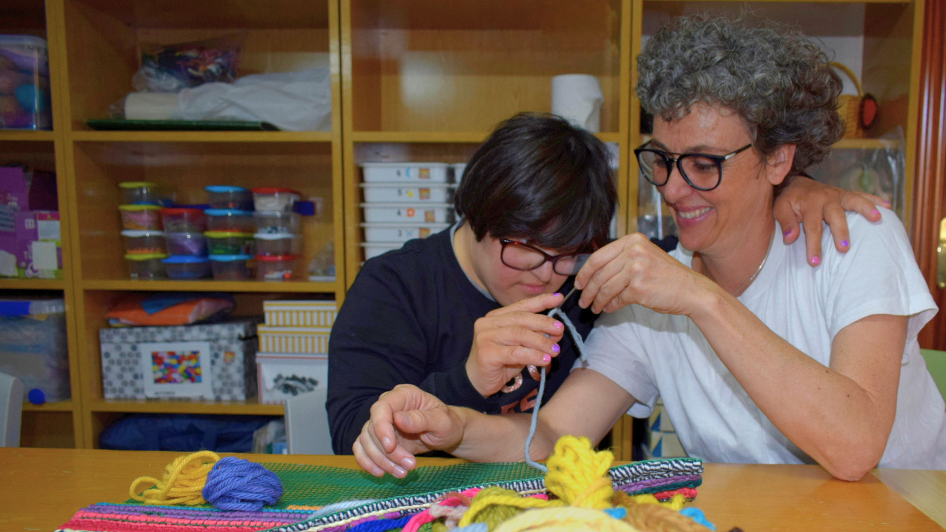 trabajadora de Hospitalarias Fundación Purísima Concepción junto a un niño con síndrome de Down en un taller de manualidades